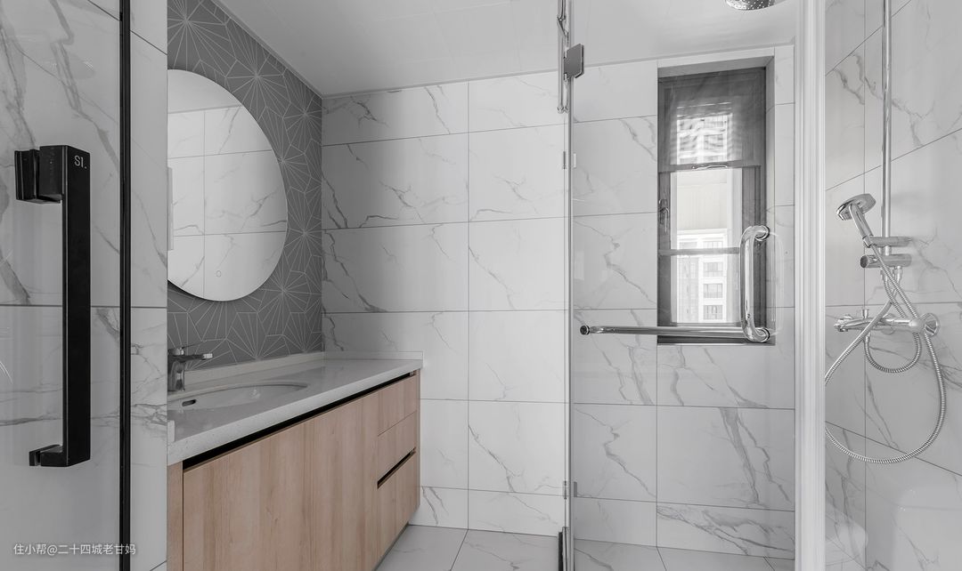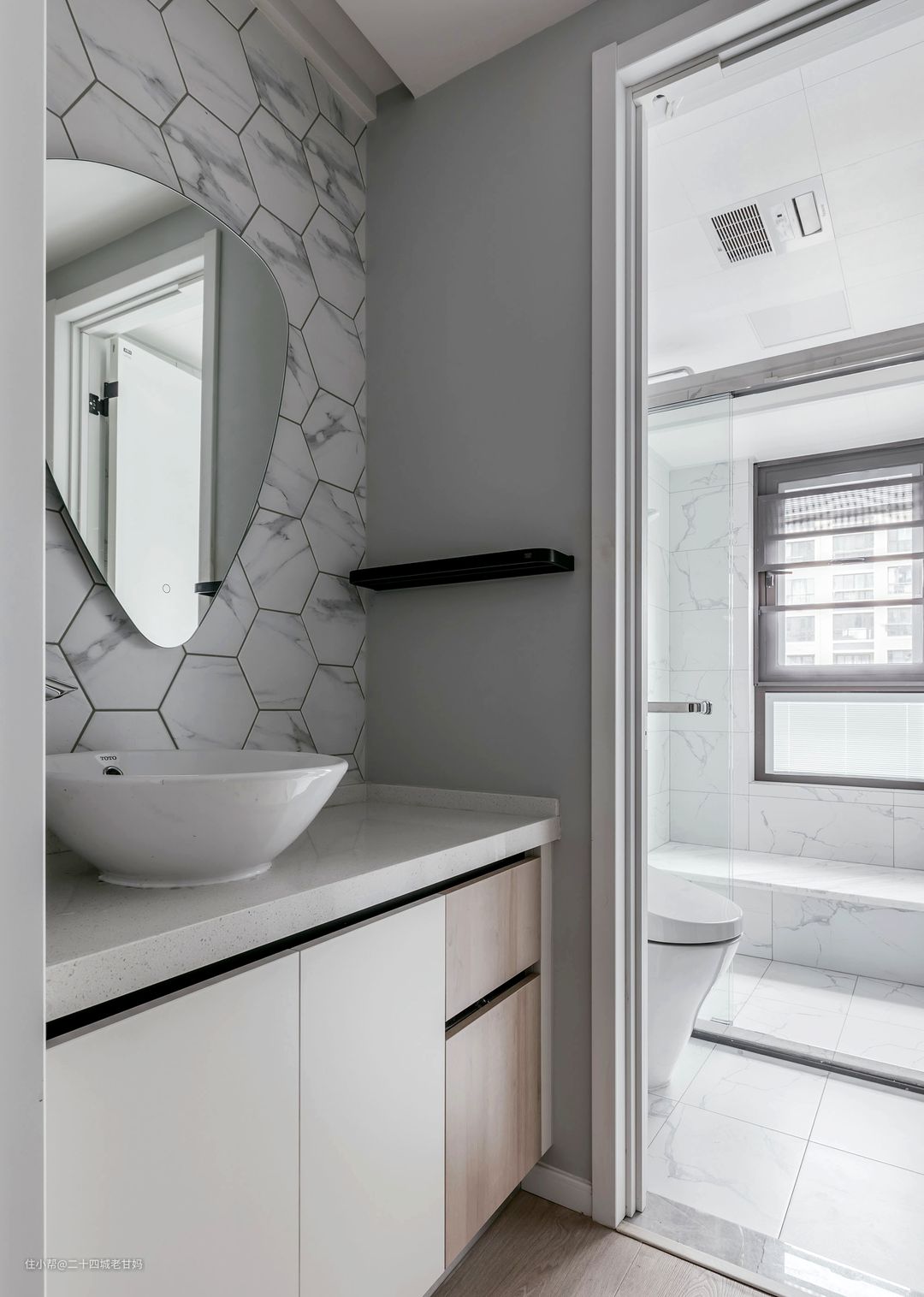 卫生间设计以白色大理石通铺为主,洗手盆墙上用不一样材质,带来不一样的视觉层次感受。两个卫生间面积虽然有限,但利用合理的规划,让人感觉不到暗淡和压迫。精致的镜子、水龙头、置物架也非常现代感,干湿分离设计,非常实用。
