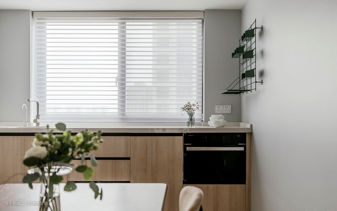 餐厅靠窗边位置定制的西厨区,天然大理石台面搭配原木色柜体,整洁明亮,嵌入式电器节省空间。让台面保持干净整洁。