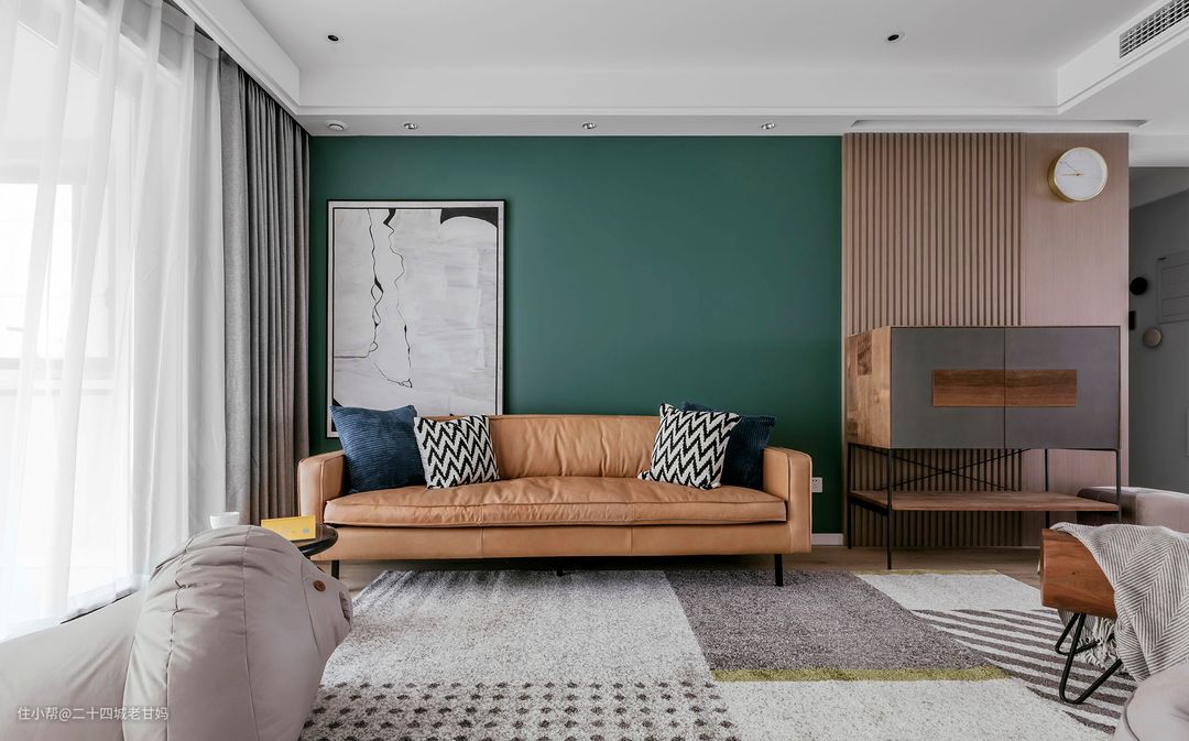 橙色的皮革沙发和绿色背景墙放在一起,形成强烈视觉效果,绿配橙,非常亮眼。背景墙上简约抽象画,结合沙发下浅灰色地毯,刚好在色彩上形成视觉平衡。为整个客厅带来更多视觉层次。