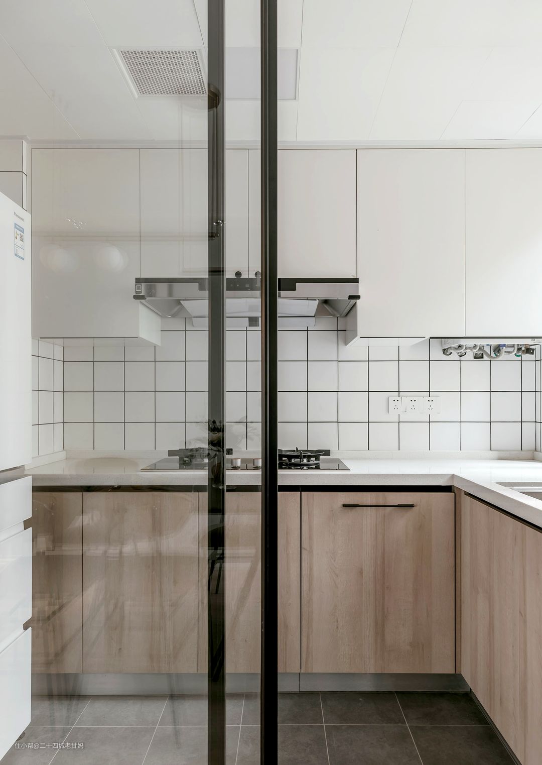 厨房在餐厅里面,封闭式设计,厨房低柜也是原木色和天然大理石结合保持统一风格,墙面铺贴白色小方砖,和白色吊柜相呼应。让人感受不到空间狭小带来的视觉压迫感。