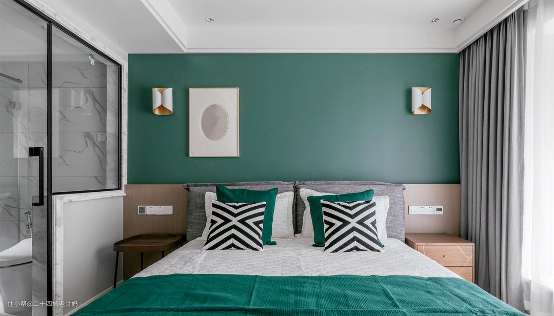 卧室延续客厅的风格,同样的吊顶设计和橄榄绿色墙面。中间是亚麻床靠背加入绿色点缀,营造安静睡眠环境。床头两边对称式北欧氛围灯让整个卧室显得更加精致优雅。