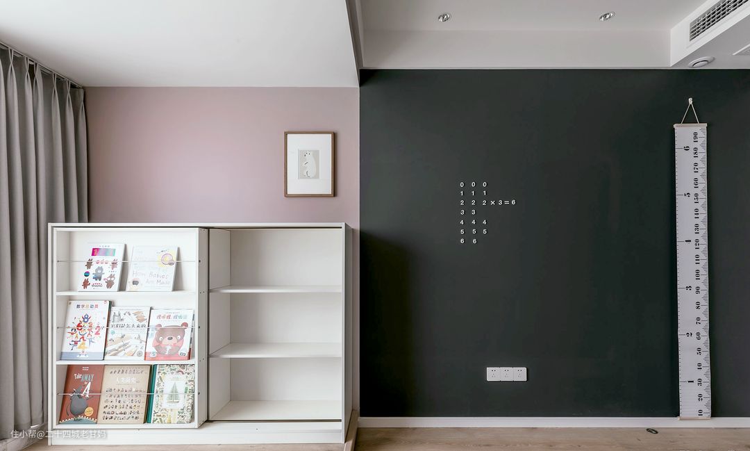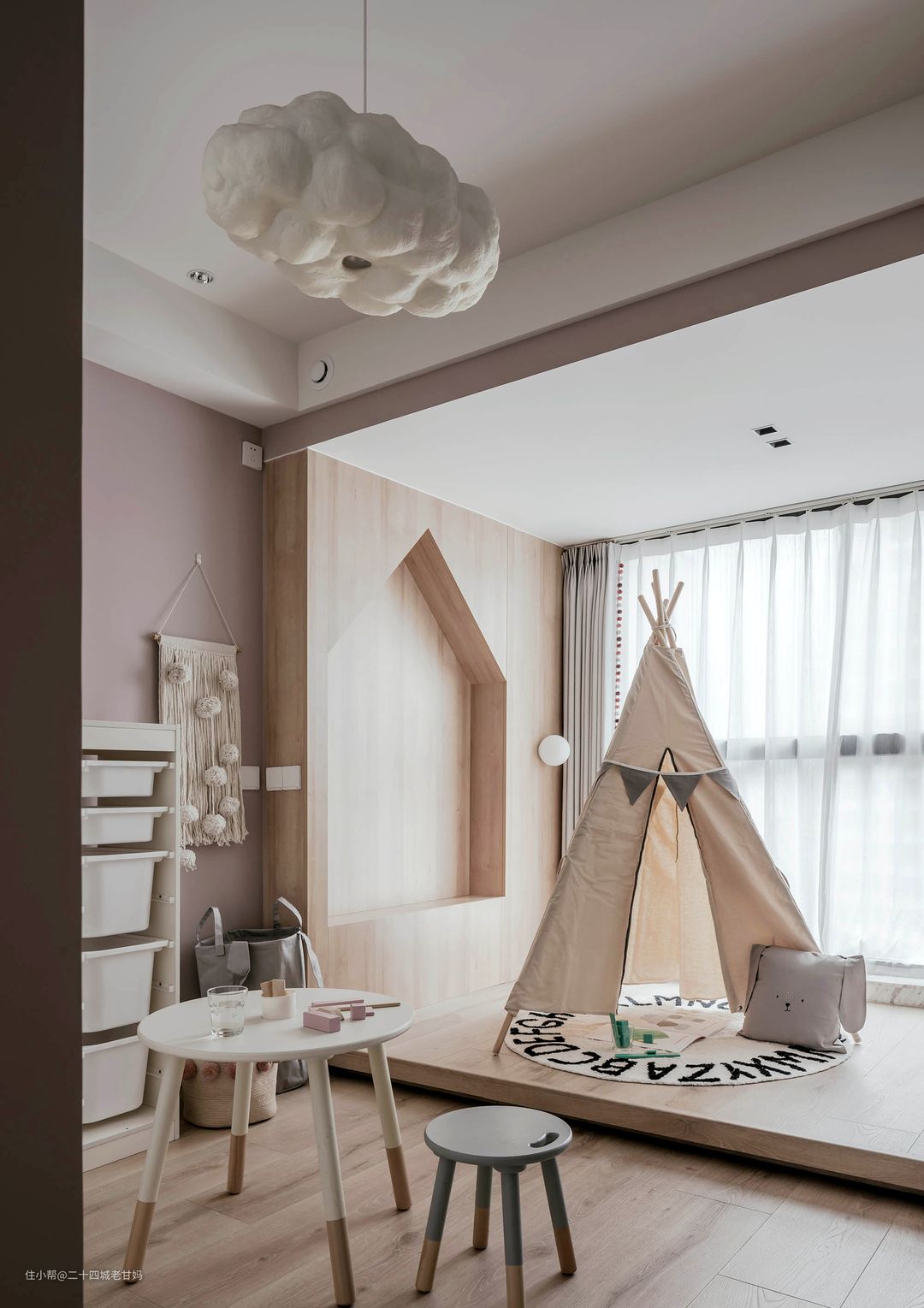 儿童房现阶段是属于宝宝玩乐空间,磁吸黑板墙,云朵灯,玩具收纳柜。落地窗带来的采光让整个房间温馨明亮,靠近窗边位置抬高十公分做地台,后期放上床垫,搭配一个儿童学习桌就是儿童房。