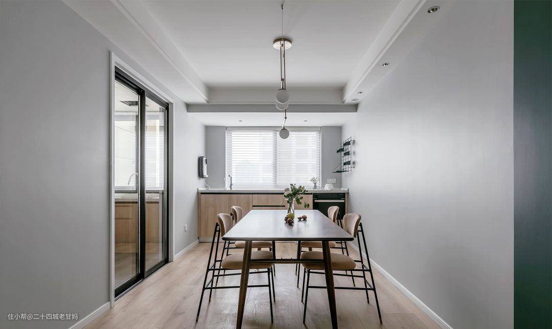 跟客厅相连的餐厅,整个墙面以浅灰色打底,清新明亮,原木色的餐桌、柜子、和地板为空间添加一些温暖色。墙面留白是女主人要求,将来可以挂上孩子照片当作照片墙,当作餐厅一景。