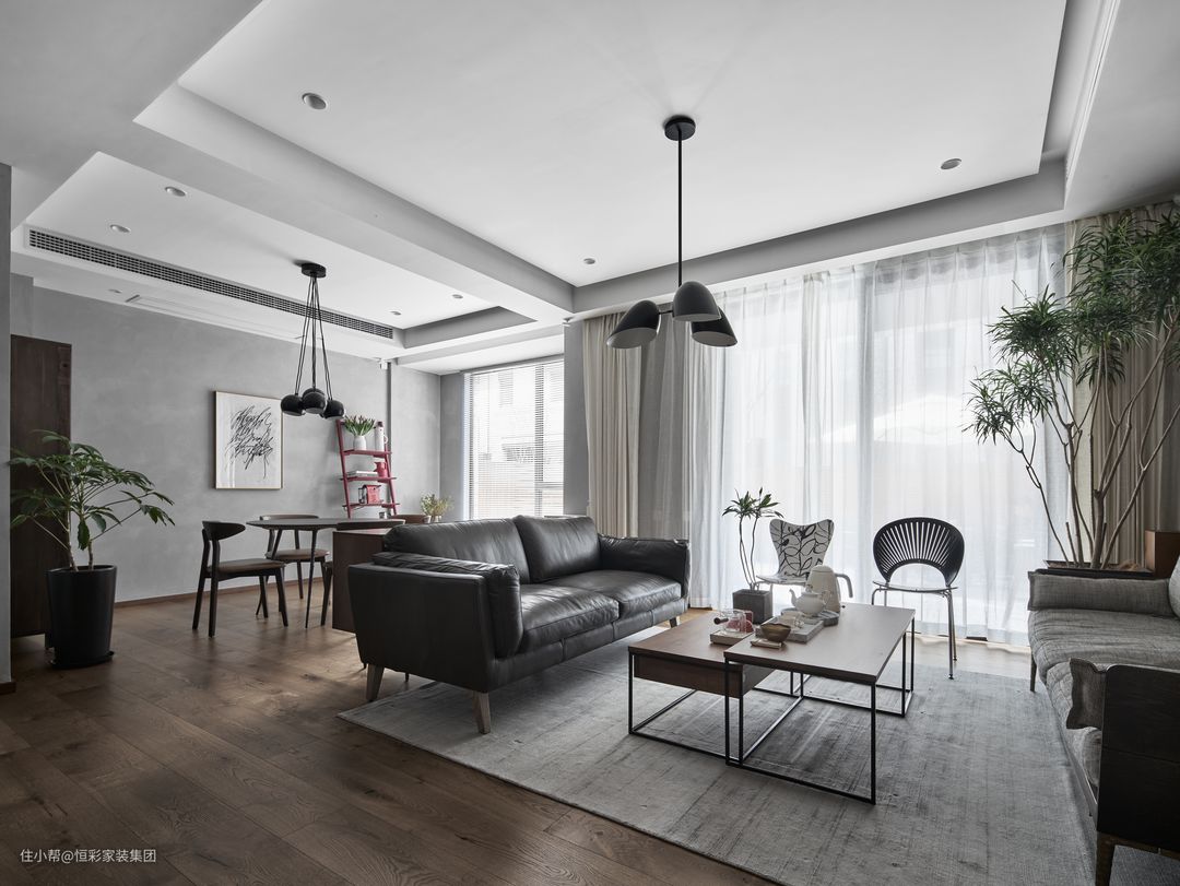 黑白灰的搭配是永恒的经典,木地板,灰色地毯、红色置物架,都有着极佳的视觉层次感,衬托出了工业风的质感。设计感十足的家居优雅伫立,在同一空间下演绎一出精彩的戏剧。