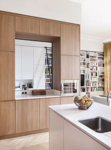 如果家里的空间比较小的话,可以做成顶天立地的柜子,除了可以当做隔断墙使用,另外一面还能做成一体式厨房,柜子的中间留空做成厨房料理台面,电器也可以嵌入柜子里,对于小户型来说可真是再合适不过了。