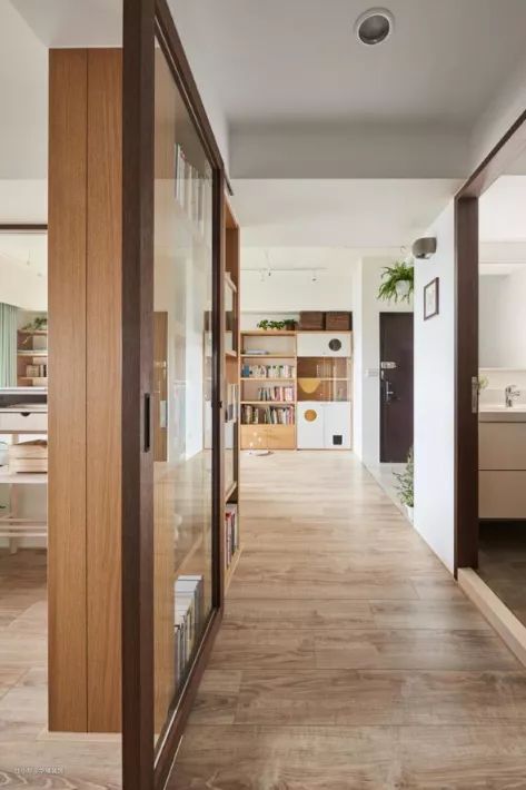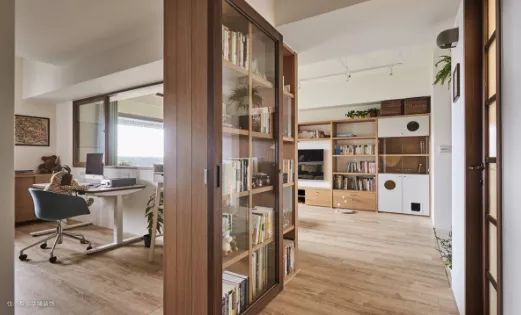 只是打柜子还不够,在柜子上再安装玻璃推拉门,这样可以保证隔断出的各个功能区的隔音降噪,玻璃的材质通透,也不会影响空间的采光,效果十分不错。