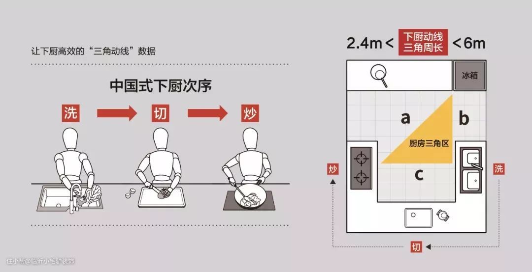 根据中式做饭的习惯,厨房的动线通常都是基于“洗-切-炒”出发的。“民以食为天”,咱们中国人对吃还是非常讲究的,下厨做一顿中餐所用到的配料、工序都比较多,合理地把流程中用到的东西分布并以合理的动线布置,会让做饭省力不少,避免做顿饭都要忙得团团转。
