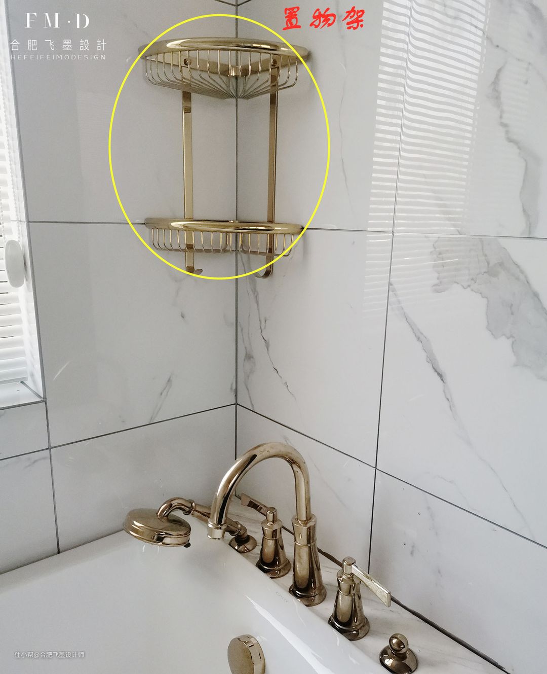 这是最常见的收纳方法了,而且成本不高,装在拐角处,上下2层,别看空间不大,其实承载力还是足够的,泡澡时需要用到的洗漱品存放在这里,拿取也很方便啊。