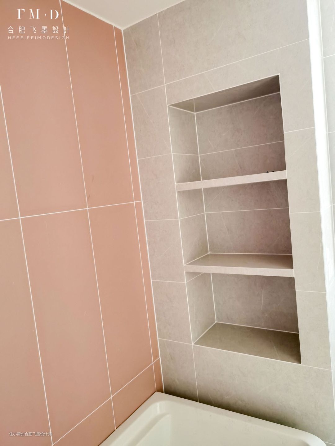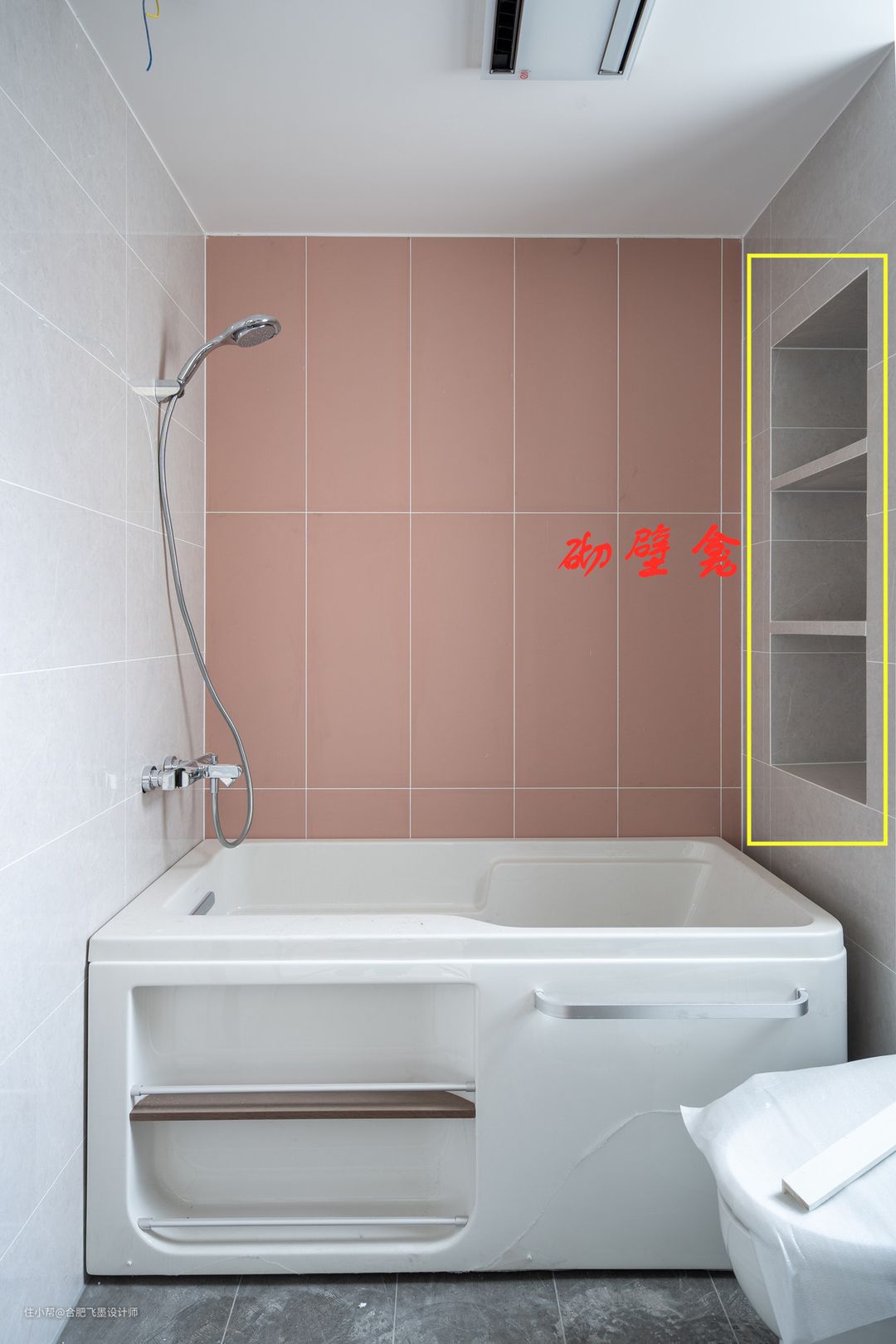 壁龛不光可以用在淋浴房,其实装在浴缸旁边也是可行的,直接砌堵墙把水管包起来,顺便在外侧留3个壁龛,贴上墙砖,这样就算有再多的洗漱物品,也不愁没处放了,摆放整齐,空间最大化。