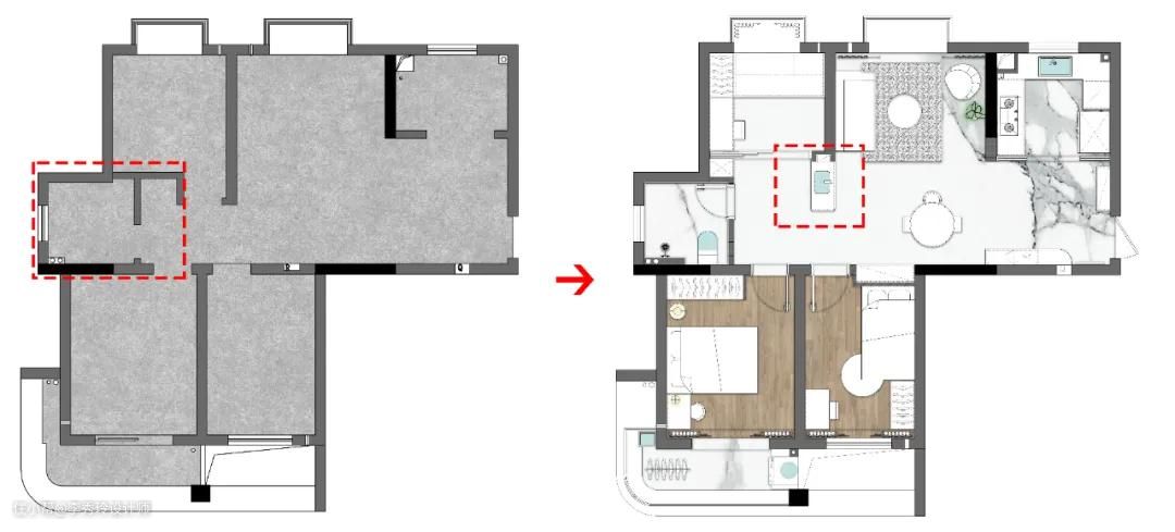 原始卫生间也比较拥挤,为了整体空间的舒适度,我们将洗手台外移至客厅、卧室之间,利用侧墙延伸出台面,不管是晨起洗漱,还是来客洗手,动线都是最短。