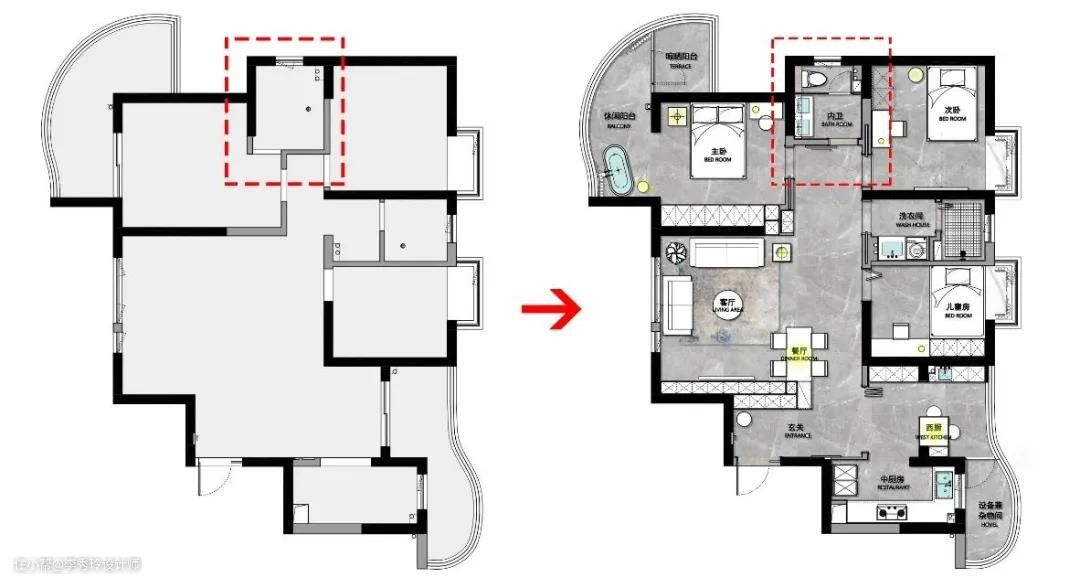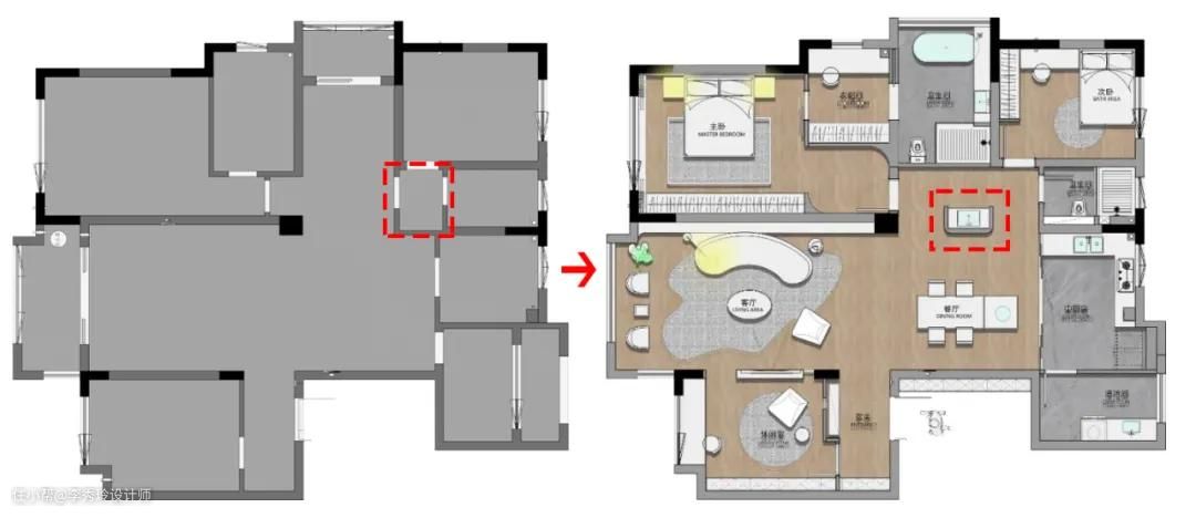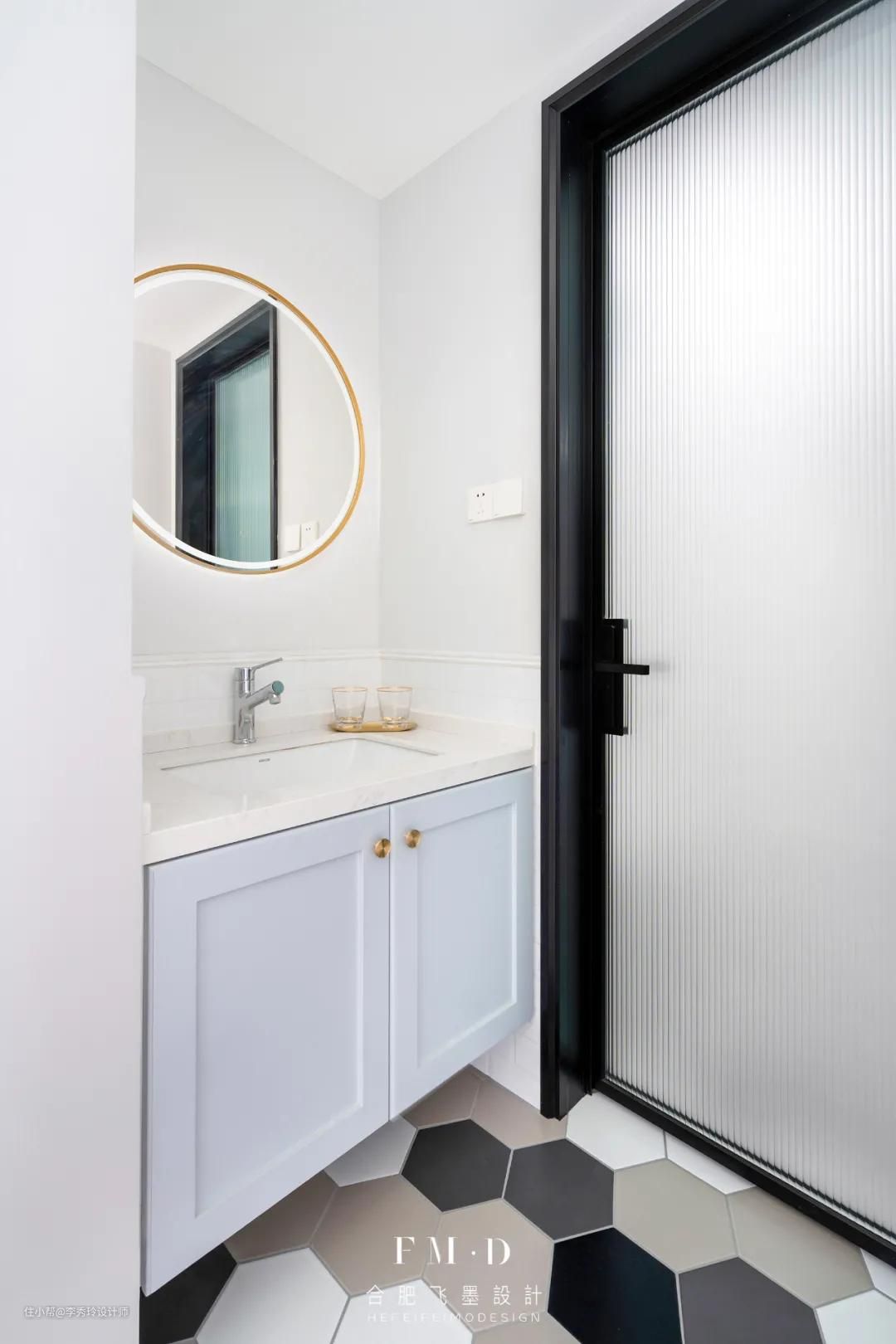 其实,对于既有主卫,又有客卫的户型,在家居人口不太多的情况下,可以共用一个洗手台。就像森林海的《暖·舍》这个家。