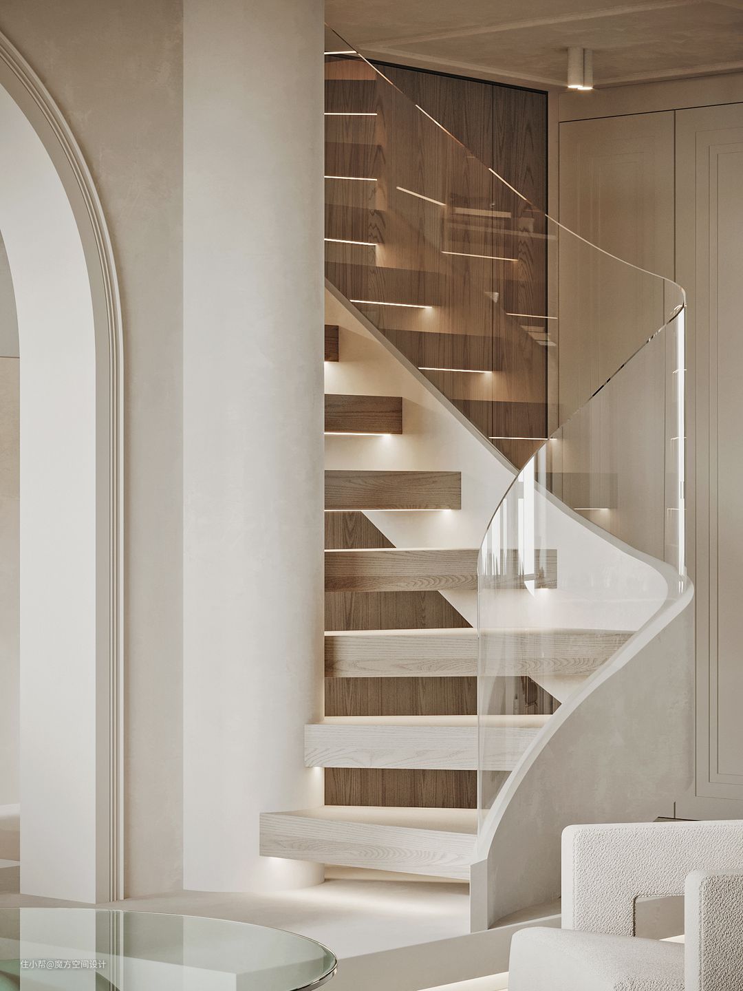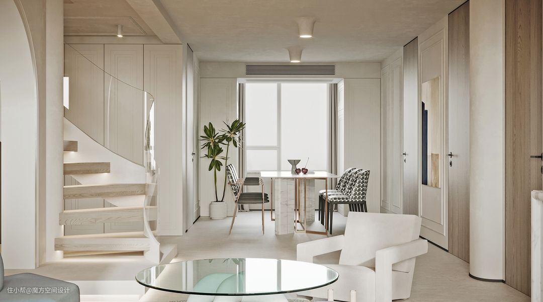 厨房与客厅间连接着白色的旋转楼梯,独具韵味。玻璃扶手视觉被无限延伸更加简洁,空间却不让人感到压抑。