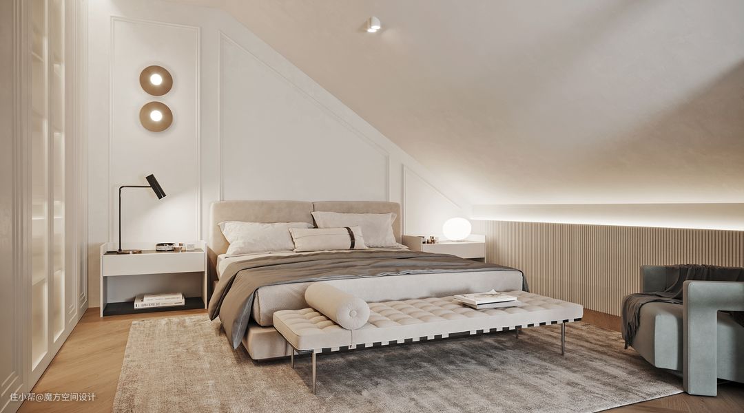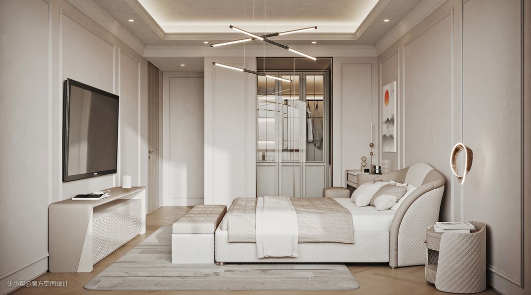 浅色系卧室极简温柔的气息轻轻荡漾开来,隐藏式衣帽间玻璃门,光线能够肆意穿梭,同时释放出了更广阔的空间。墙上的壁灯造型也简单精致,星星点点的灯光让人卸下了疲惫,身心轻松,营造了典雅清净的氛围。