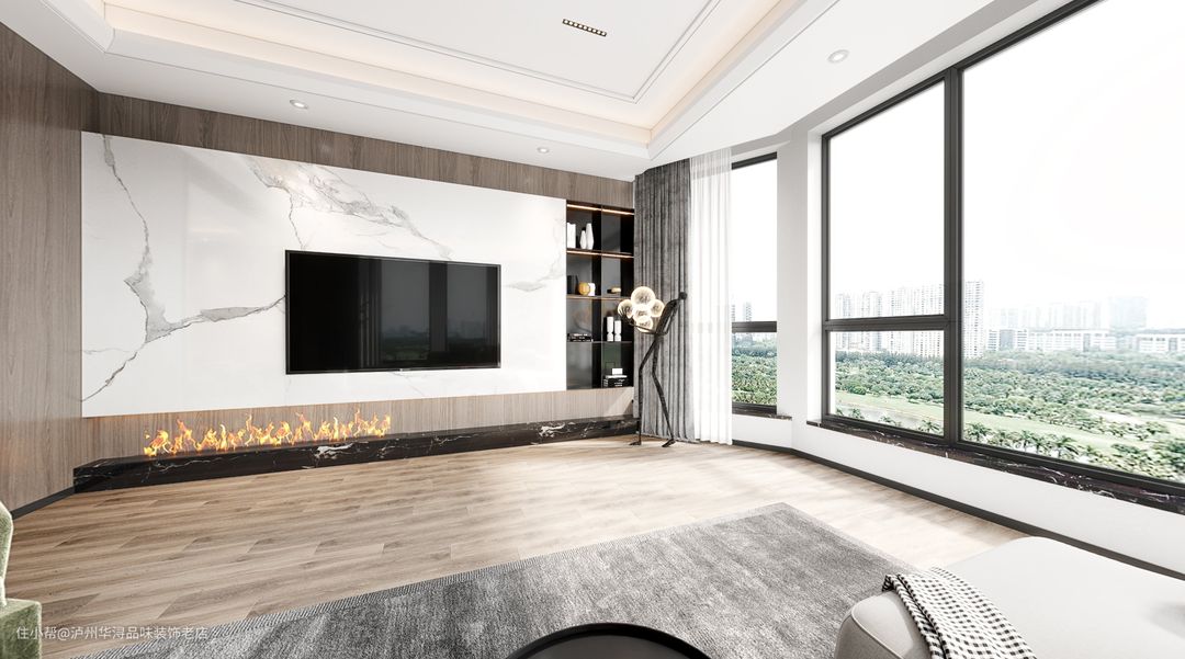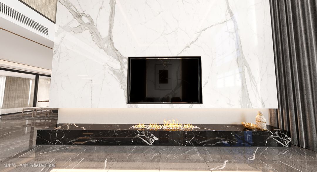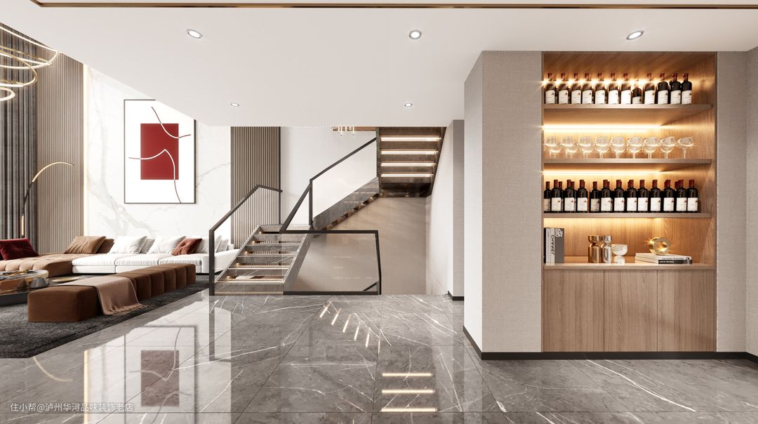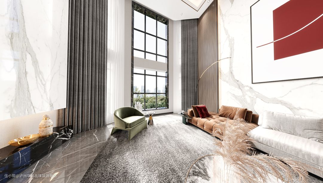 这是一套跳空的设计,大的客厅设计用这样的轻奢现代风格是很大胆的,现代轻奢是很简单的造型,所以大空间简单造型,需要很强的工地才行,简单的背景墙怎么样空间丰富起来,所以设计师在设计的时候也考虑到这一点了,所以背景墙的设计出了材质之外,还利用了软装的搭配,一幅个性时尚的装饰画让空间更有立体感,家具的选择让大空间一下丰富起来。