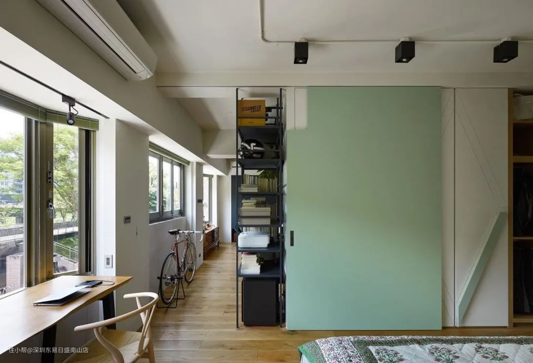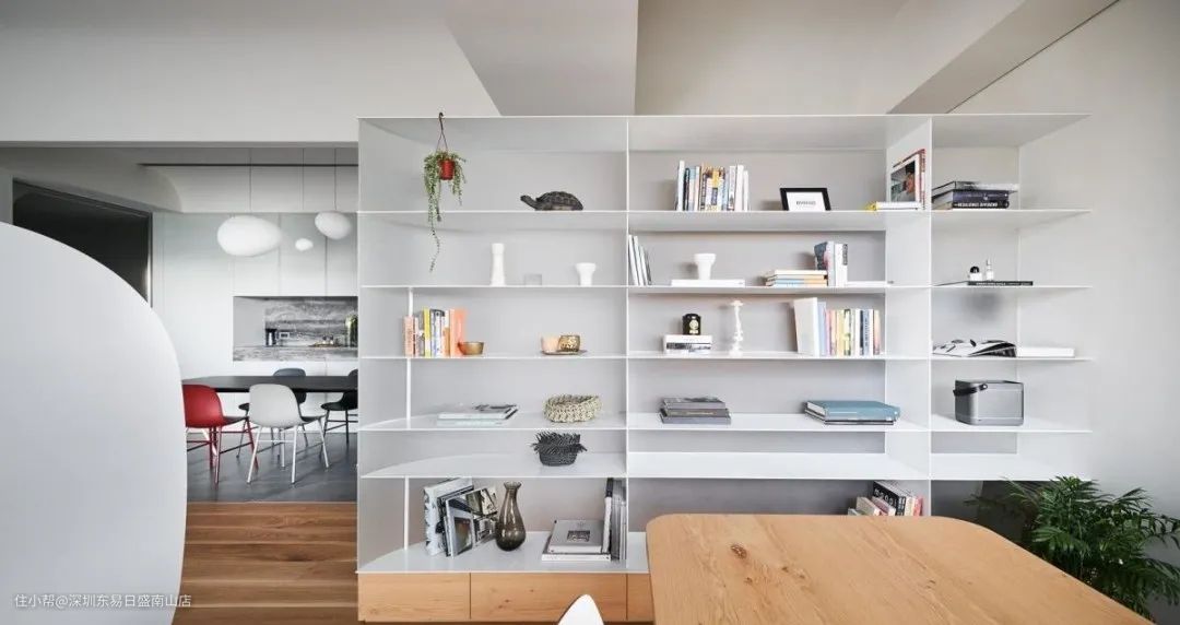 卧室隔断可以使用双面柜的设计技巧,一面是大餐桌旁的大型书柜,另一面则是卧室床尾的衣柜,同时满足两个格局的使用机能。