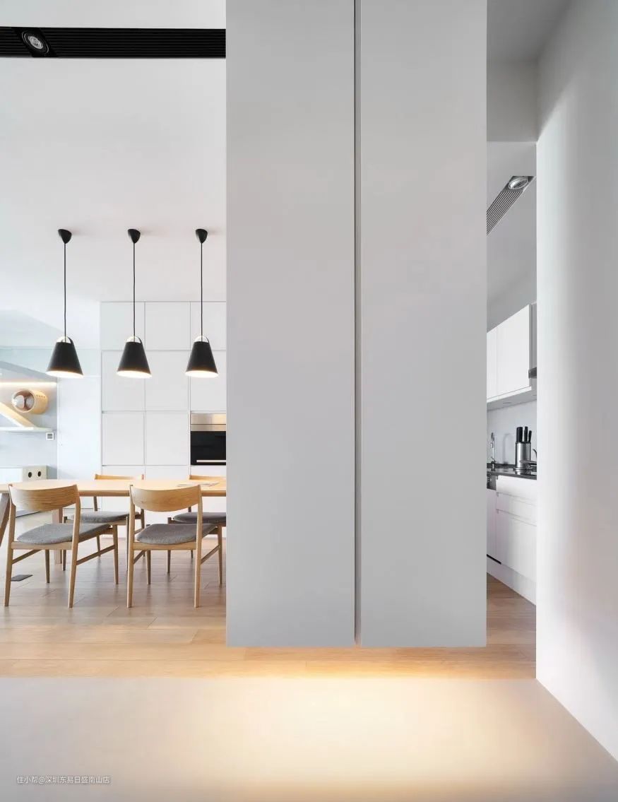 此外,悬空的玄关柜在背面融入洞洞板设计,化身为开放式厨房的收纳墙,可以挂上饭匙、汤勺等生活用品。