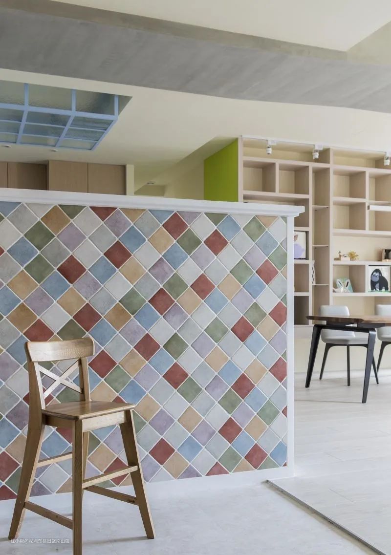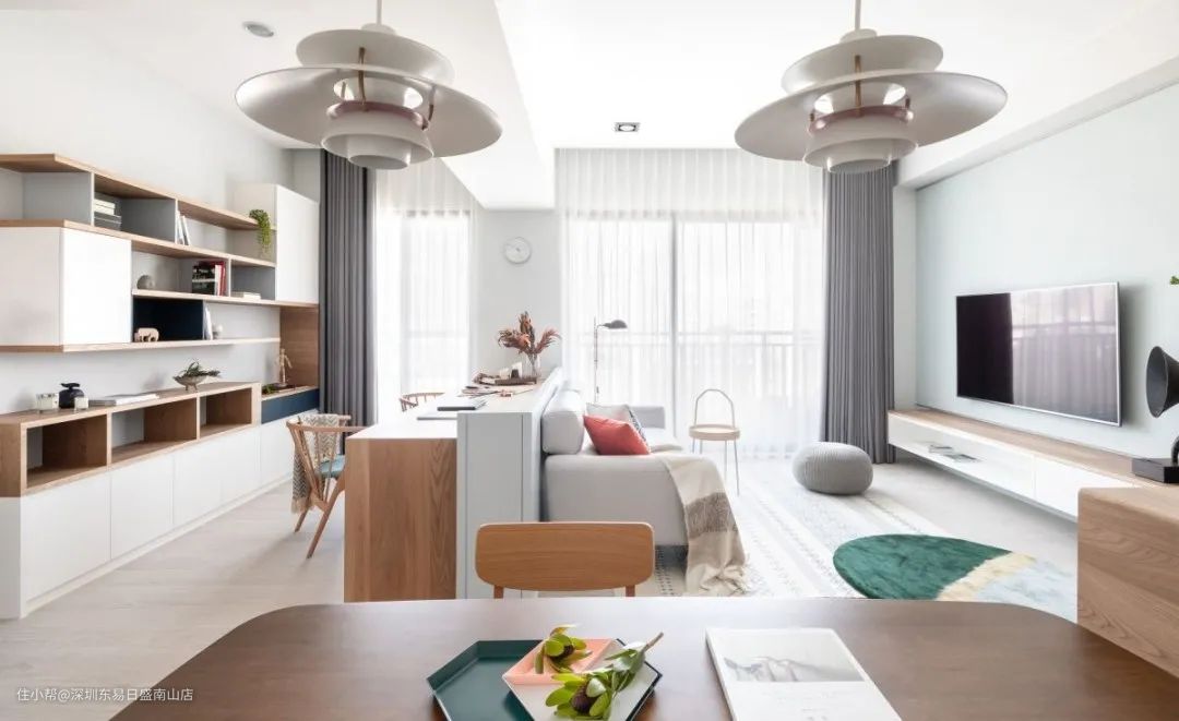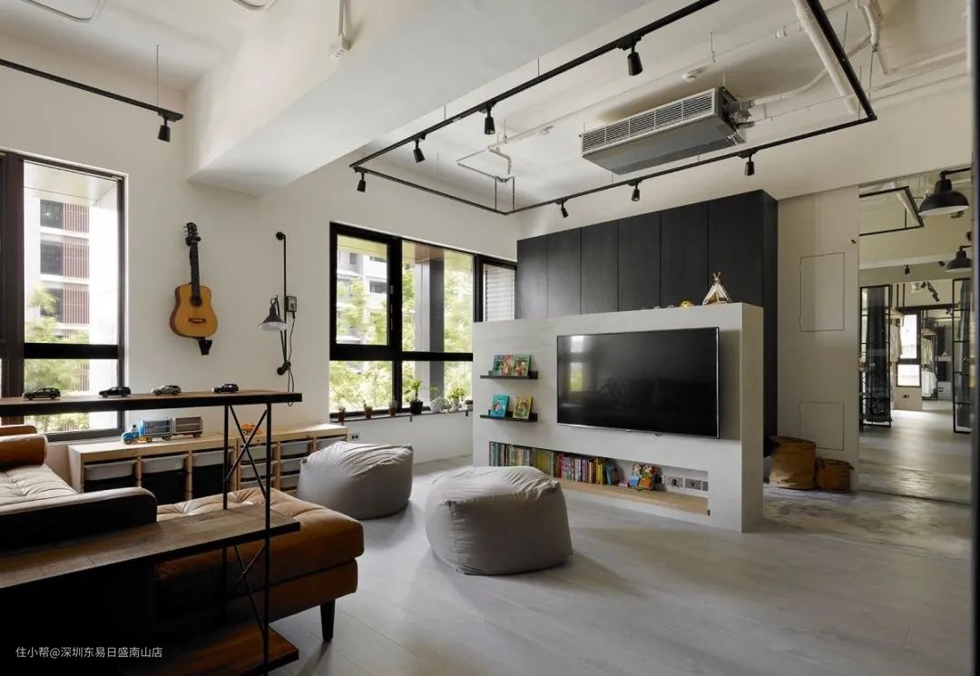 客厅电视墙、沙发背墙的背面,可以加入一整面的收纳书墙或是阅读书桌,设计出一个阅读空间,可以很好的与孩子沟通交流,也可让出更多的居家空间。