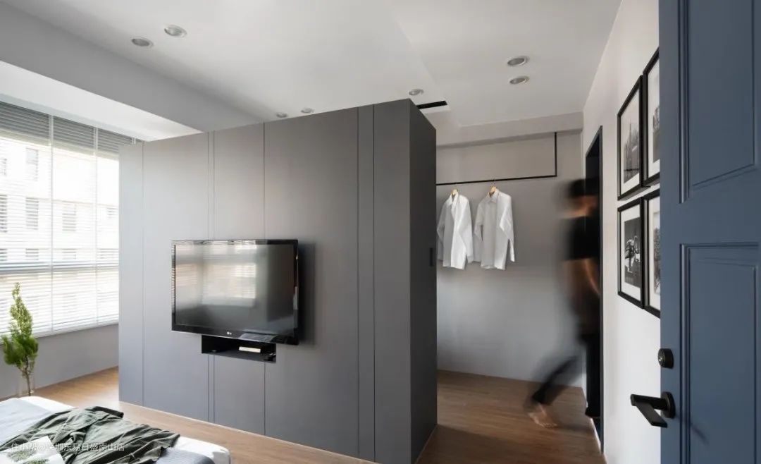 无论是床头墙、电视墙,利用墙面的位置挪移,墙后就可以加入更衣室的衣柜、化妆台,这样起床穿衣打扮,相当方便。