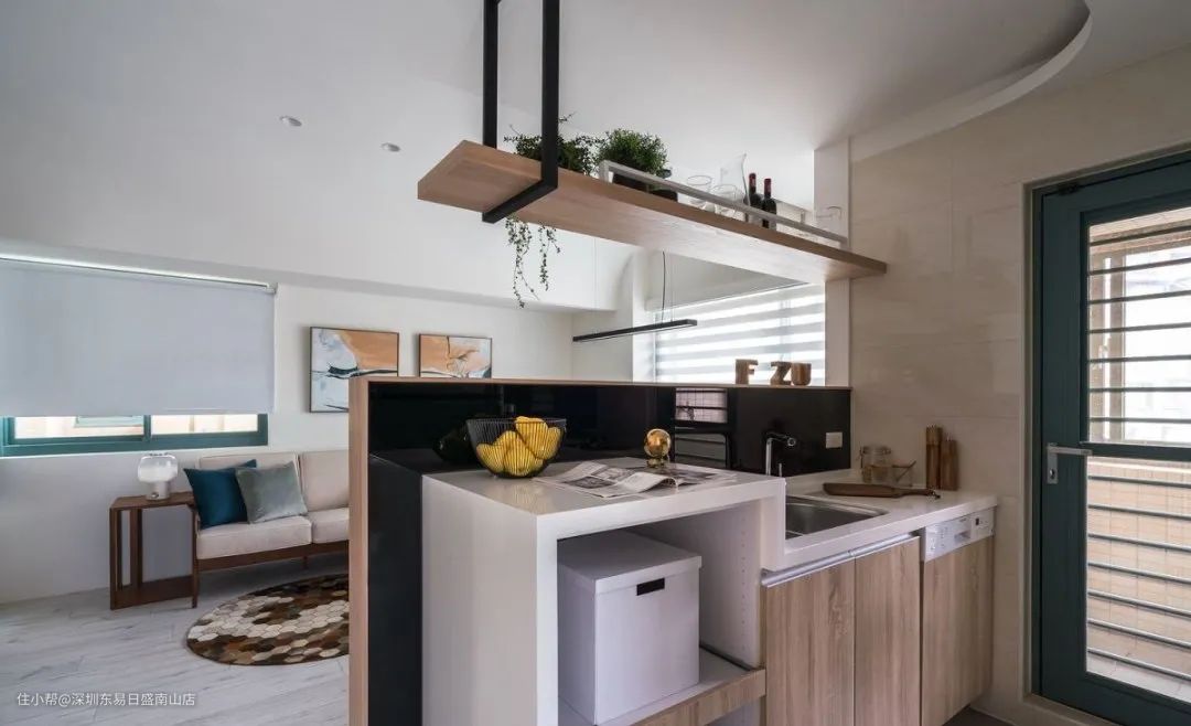 甚至半高的墙面上方还可以设计铁件吊柜,来扩增收纳空间,同时保留室内的宽敞明亮感。