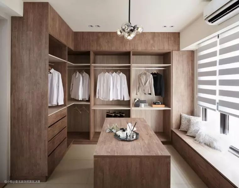 衣帽间采用整体定制,全木纹设计,有做旧的效果,质感高级。衣柜内部分区明确,还做了定制飘窗,也可以收纳。