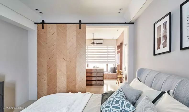 次卧的隔壁是衣帽间,两者之间是一扇谷仓门,采用不同颜色的原木人字拼接而成,具有很好的装饰感。