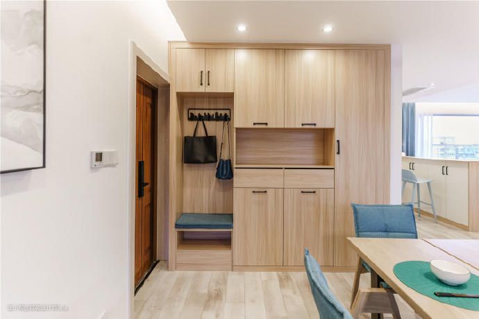 无论是业主的起居日常还是亲朋好友来家小聚,进门的第一个空间就是玄关。不仅需要大量的储物空间,还需要巧妙地融入换鞋凳、穿衣镜等具有实用功能的物件。为了整合这个空间的功用,大部分家庭都会选择组合定制柜。那么墙面如果也使用木饰面的话,就可以保证整个空间的视觉统一性,同时增加温馨感。