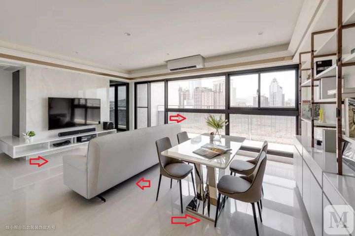 除此以外,横厅的客餐一体设计,大家还可以利用矮柜、吧台、书柜等等家具用作隔断,这样区域分开更加明显