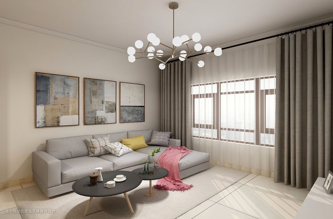 客厅软装一定不要忽视了点缀,比如说柔软的浅灰色布艺沙发、亲肤的长绒毛地毯、木框挂画等,可以选择业主喜欢的颜色进行搭配,配套亚麻抱枕,再搭配一个亮黄色的抱枕和粉色毯子,一切都是柔软舒适,米色大理石纹的大地砖,耐磨好打理又符合了主题温馨。原木色茶几简单利落,精致的铁艺吊灯凸显与众不同的清新活力。