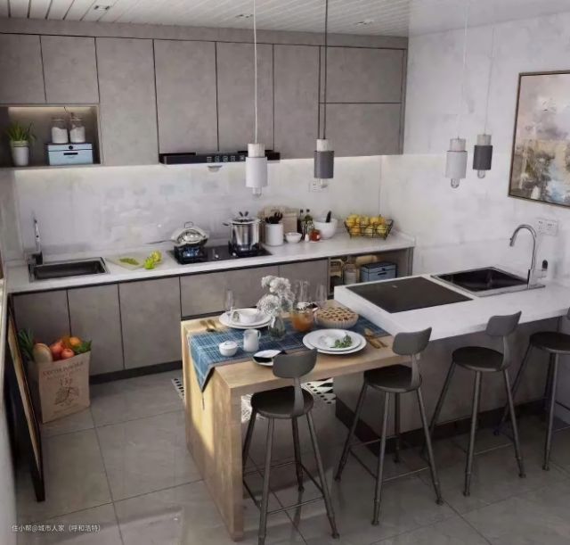 有的家庭使用的是开放式厨房,在厨房和客厅之间做一个储物吧台,一方面起到了空间划分作用,同时这个吧台也可以作为餐饮空间来利用。