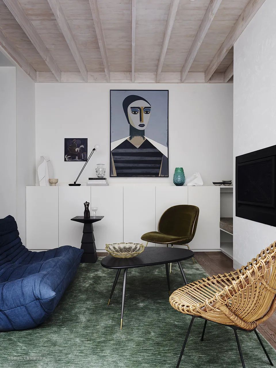 客厅和休息室之间用阶梯分割,绿色绒面地毯上,意大利高品质绒布打造的甲壳虫椅搭配手工编织的藤椅,在时尚与古典的交融中达到平衡,散发出一种静谧、闲暇的浪漫情调。