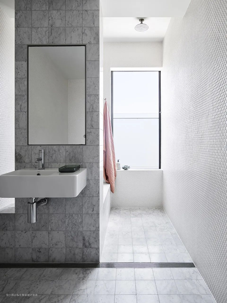 极简的浴室内整洁明亮,地面、墙面均采用不同样式、颜色的卡拉拉瓷砖打造,非常有层次感。