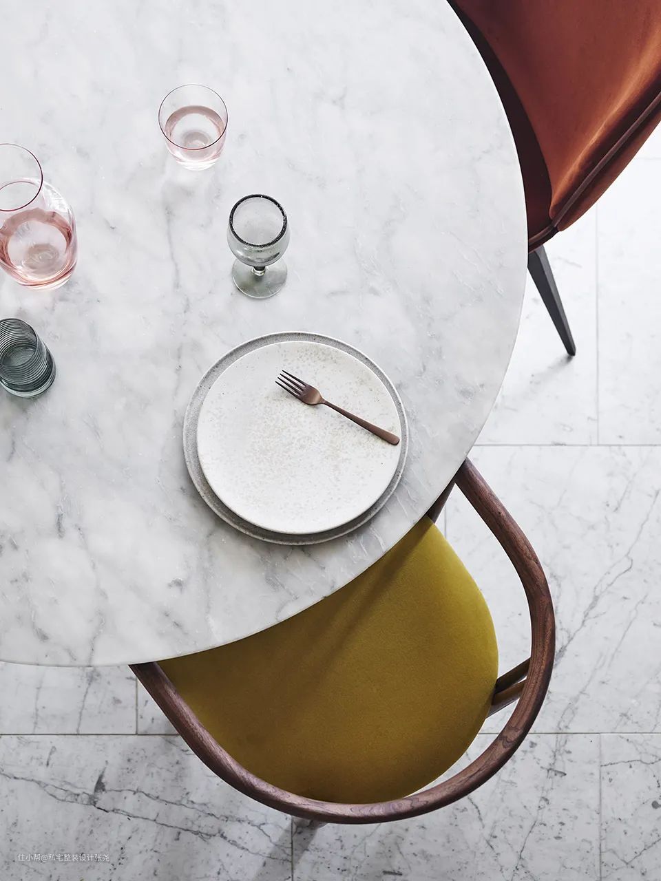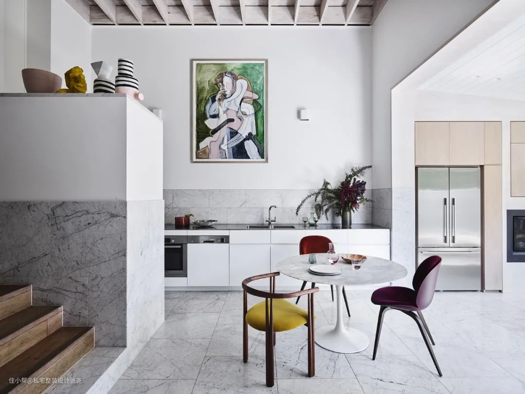 住宅用餐区,卡拉拉大理石覆在光滑的白墙上,设计师减少陈设,用简单的家具结合不同高度的平面带来的丰富视觉效果。座椅与餐具的色彩点缀在清心寡欲的环境中,给空间注入生命力。