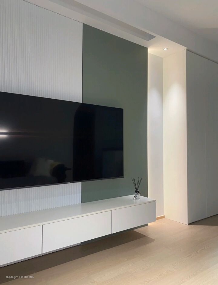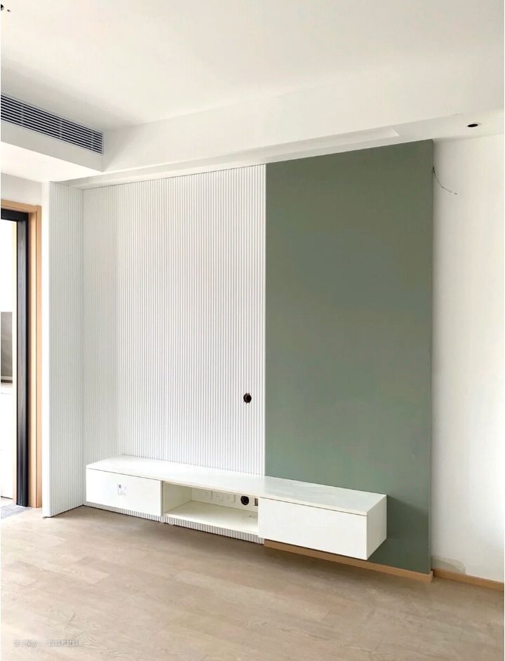 先来说说设计尺寸,整块背景墙高2.4M,宽2.6M,其中波浪板部分1.6M,绿色石膏板部分1M,电视机65寸,比例刚刚好。