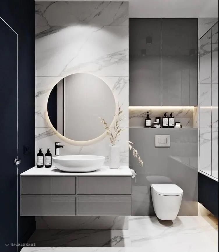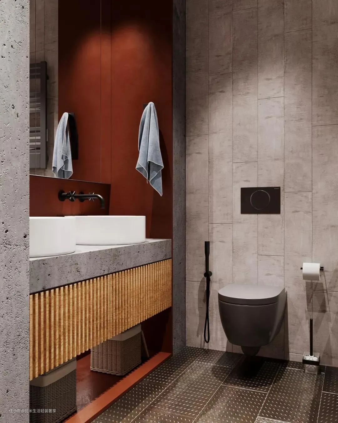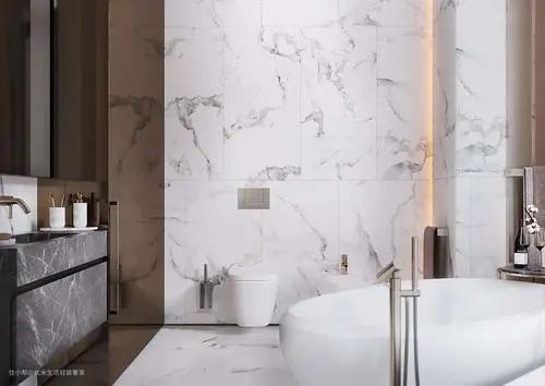具有不规则石材纹理的瓷砖简约大气,适合以大尺寸用在空间较大的卫生间中,能够凸显出纹理的质感。常用于现代简约风格,大于7㎡的卫生间。