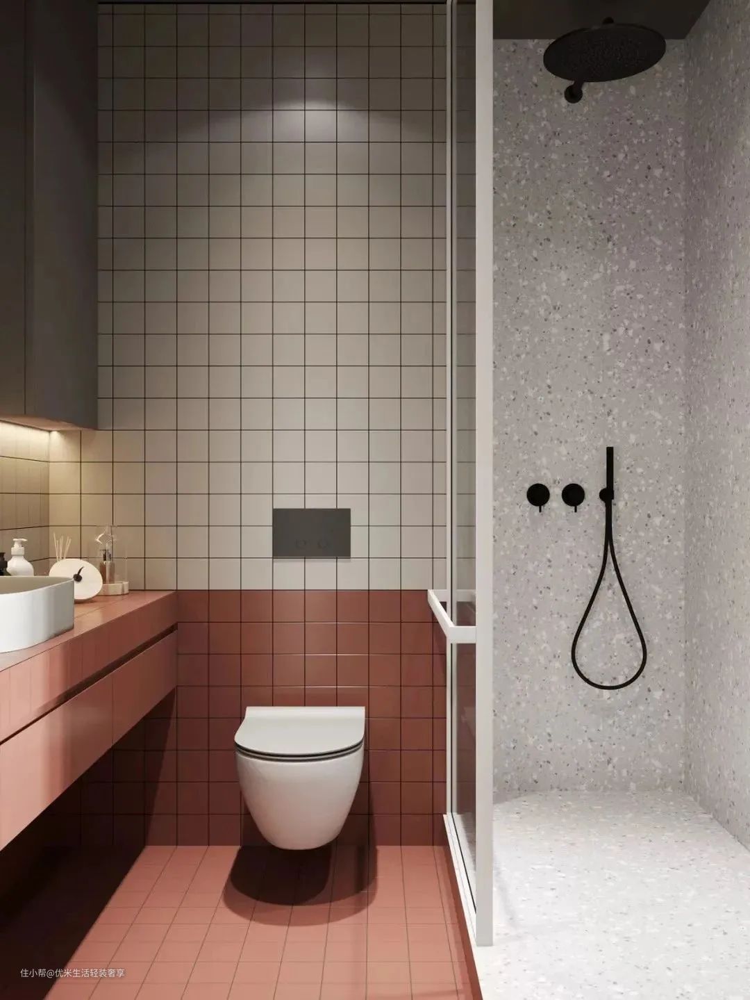 如果你觉得纯色瓷砖太单调,可以在墙面或地面加入小花砖,只需要局部做点缀就能起到画龙点睛的作用。常用于现代风格、北欧风格、日式风格,大于3㎡的卫生间。