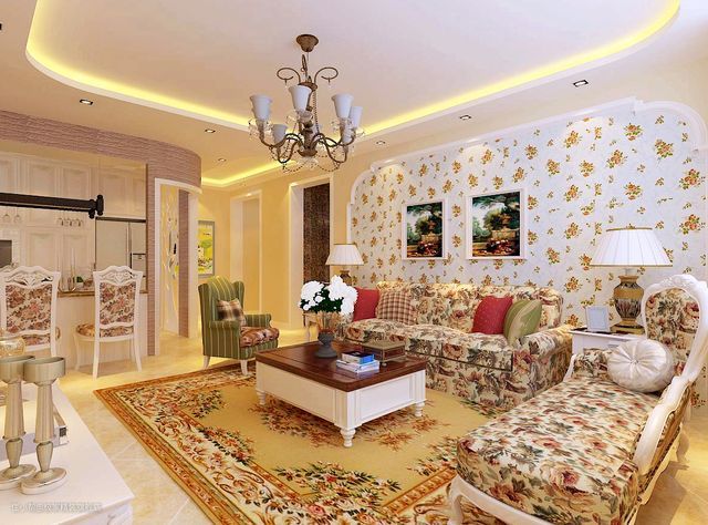 上图中,沙发和地毯都是采用了绚丽的花纹,墙壁也贴了上充满小花的壁纸,整间客厅就打造成了一个小花园。洁白的花朵在多彩的客厅中显得更加纯粹,看了就会使人安静。