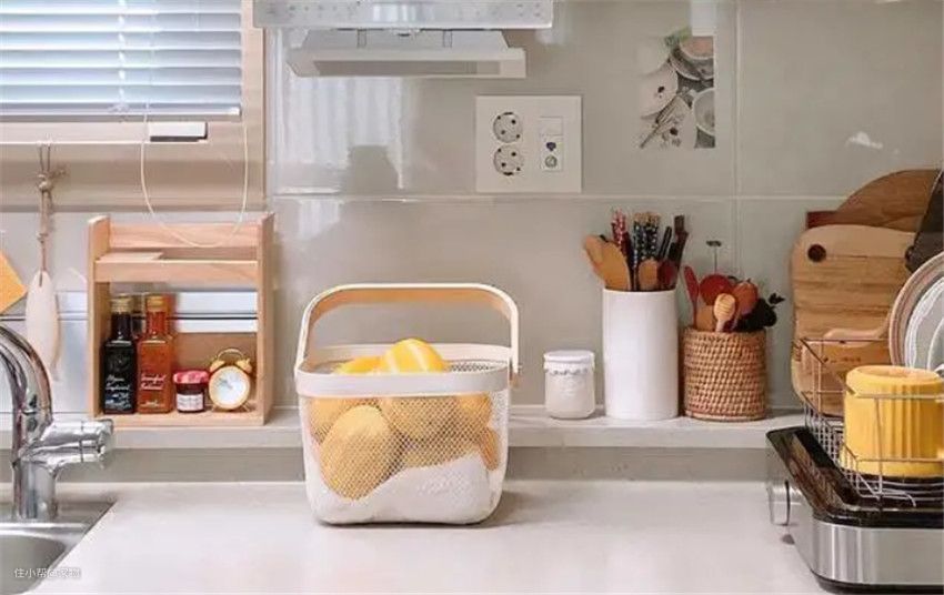 将厨房台面边缘处多抬高10厘米后,更为合理地利用了垂直空间,这样无形中多出了储物区,也能更好的将台面空间划分。上半部分是置物区,下半部分是做菜区,功能分区更为明确,互相独立不打扰,更有助于提高做饭效率。