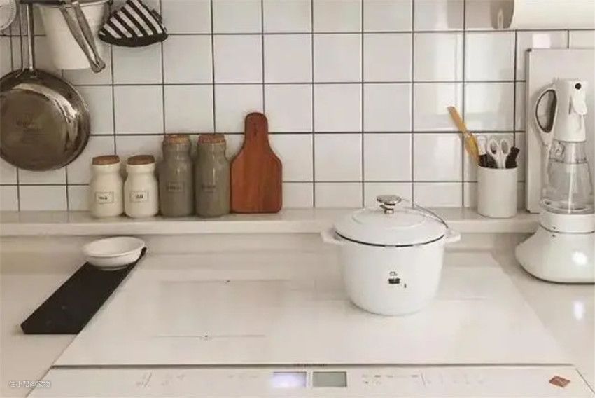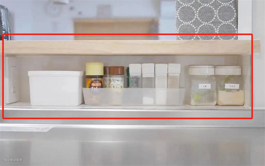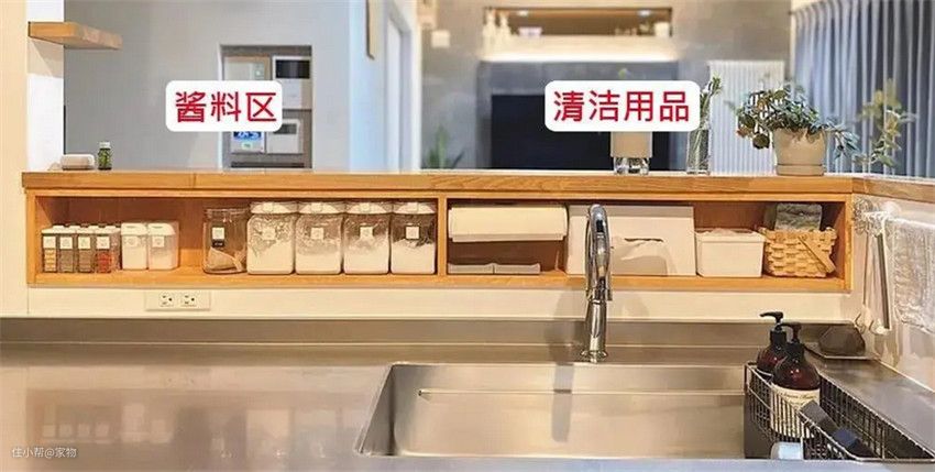 细心地日本人还会将凹槽内做功能划分,比如靠近炉灶的部分是酱料瓶罐收纳区,而靠近水槽部分则用来收纳清洁用品,这样划分一举两得,方便实用。