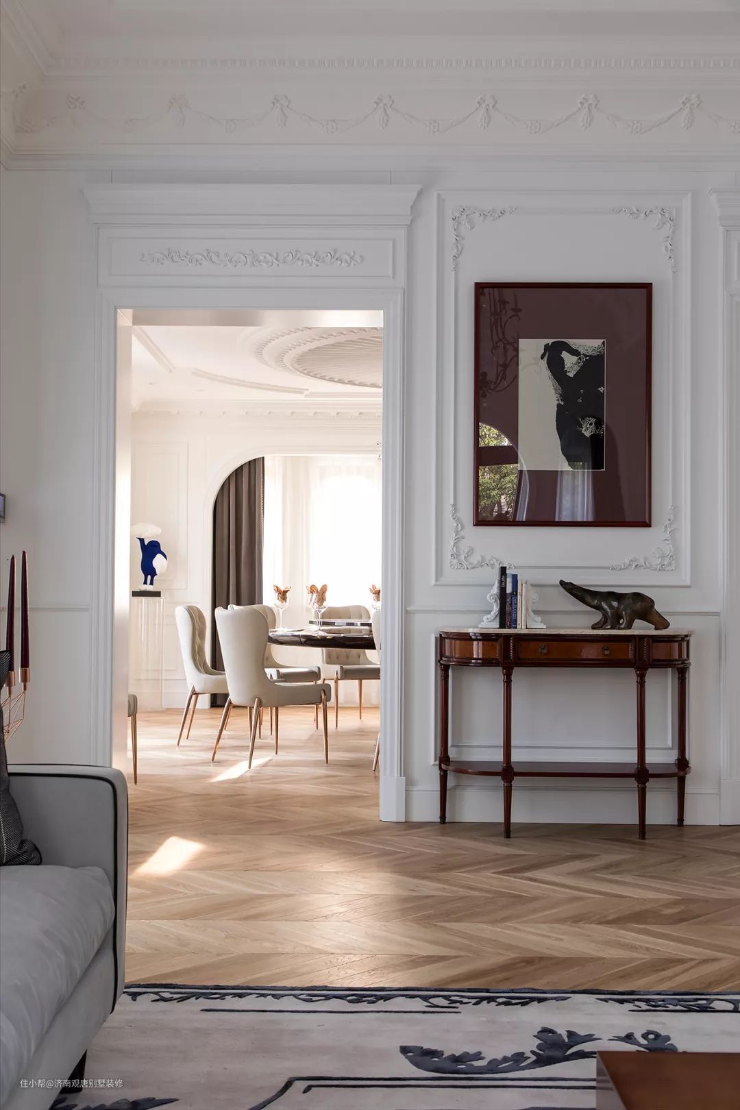 会客区域充满了仪式感,每一个饰品搭配,女业主都是化了很多的心思,软装搭配上也非常富有层次感。大块的巴洛克风格地毯,使整个会客室包裹了一层典雅气息,由于地毯的图案做了简化处理,神似形不似,所以铺在拼花木地板上,只增加韵味,不喧宾夺主