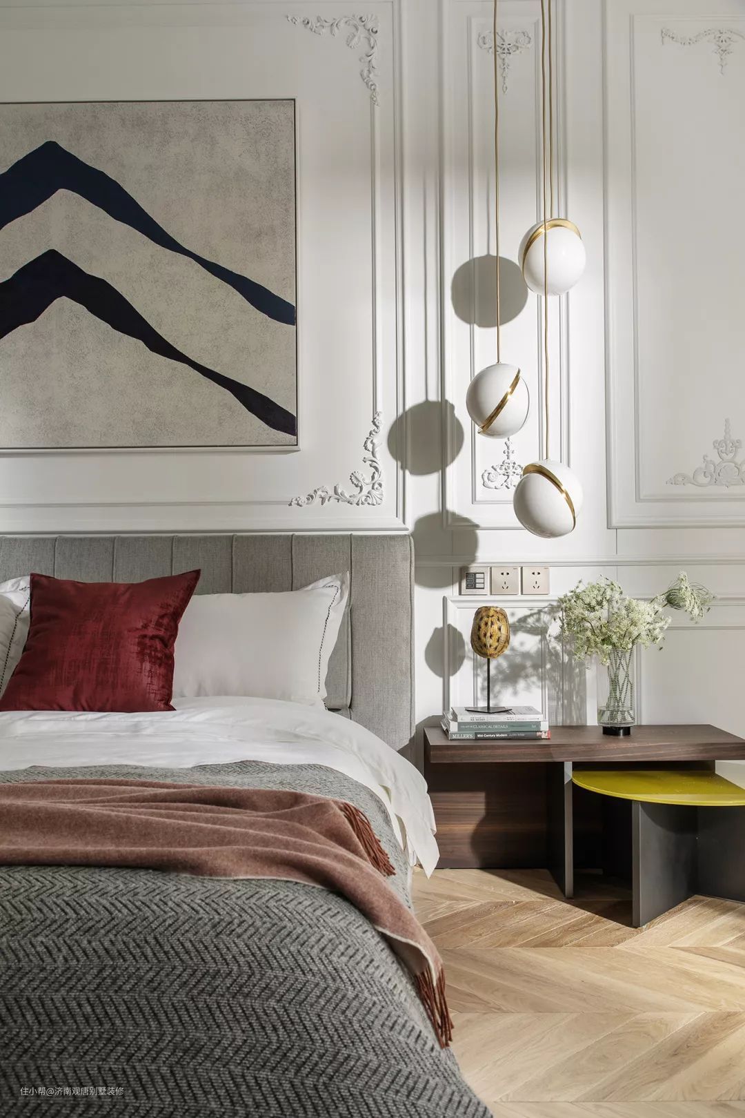 父母房的墙面没有做石膏装饰线条,而是用素净的艺术墙纸铺陈,柔软的织物大多以蓝色和灰色为主调,让整体氛围减一点华丽,多一份从容,更适合老人居住。