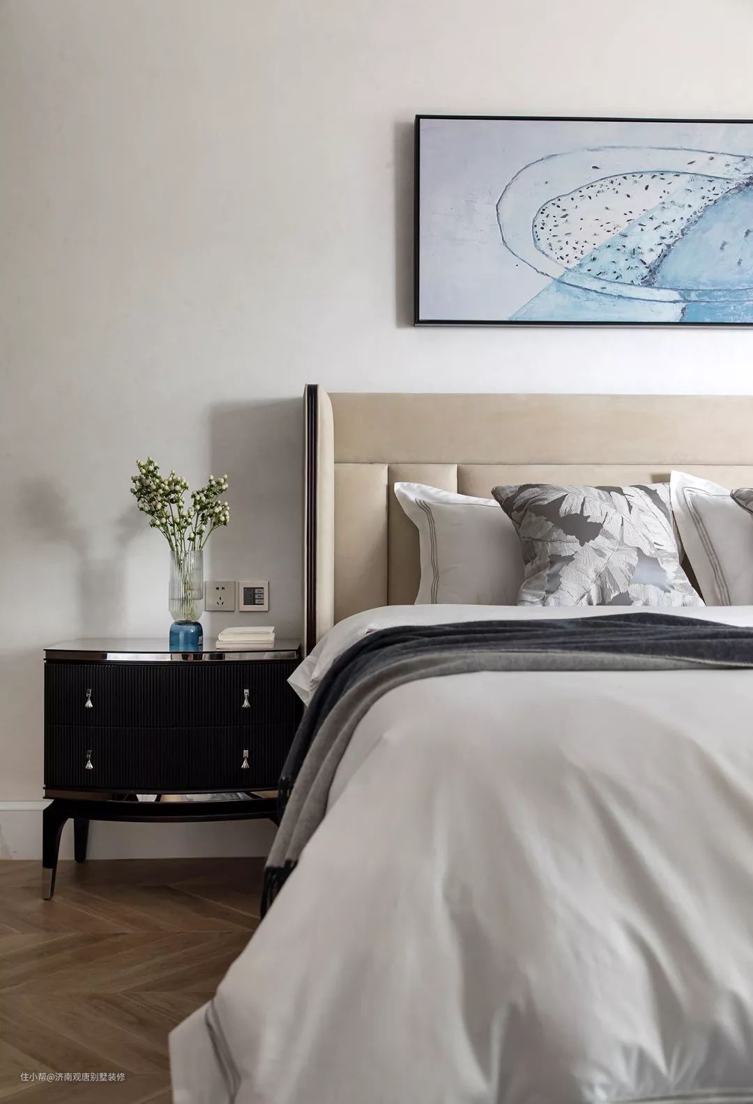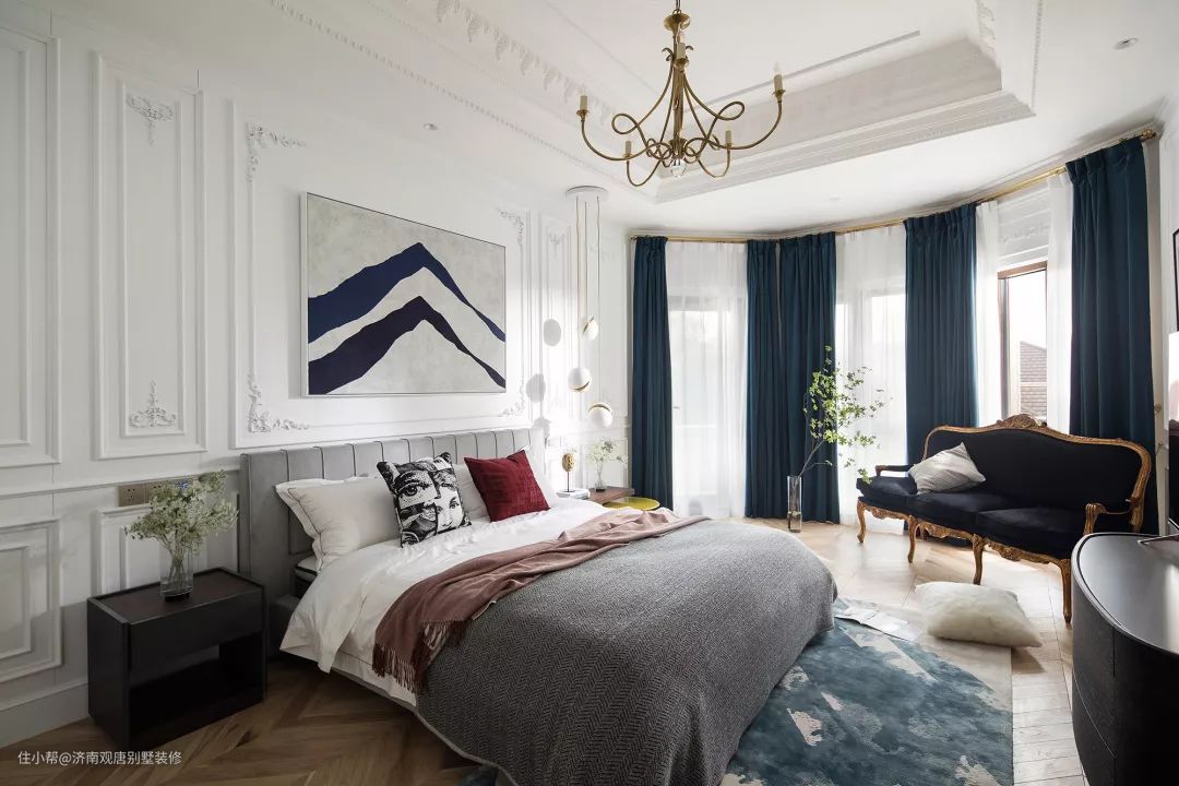 为了给主人一个温馨安宁的睡眠环境,三层的主卧选用了大量的柔软织物,丝绒窗帘、软包床头、丝质地毯······