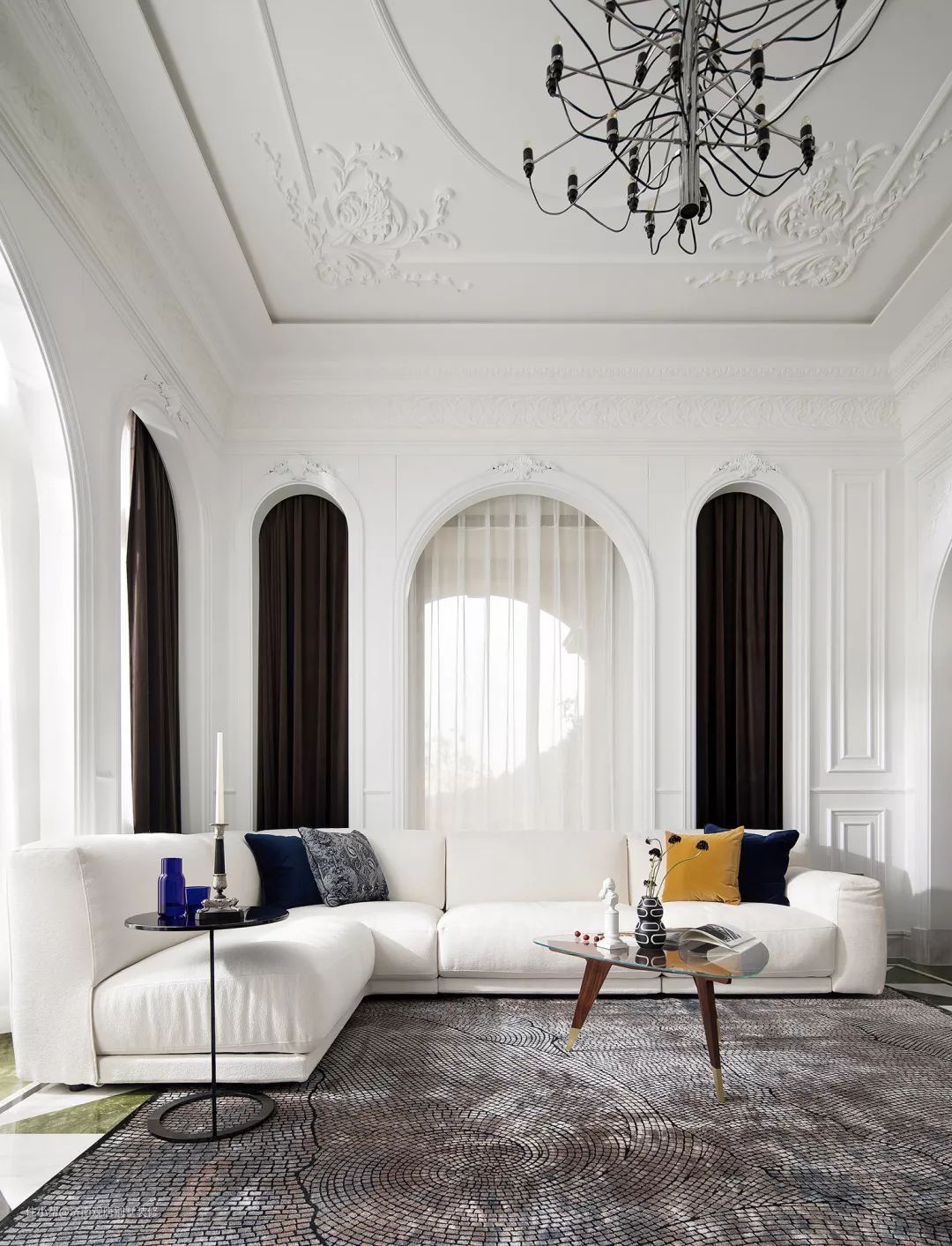 客厅空间乍看之下,平静温馨,细看之后,发现又是细腻舒适的,大空间又有着很多设计细节,大雕花石膏线,突显层高的同时,又很优雅。
