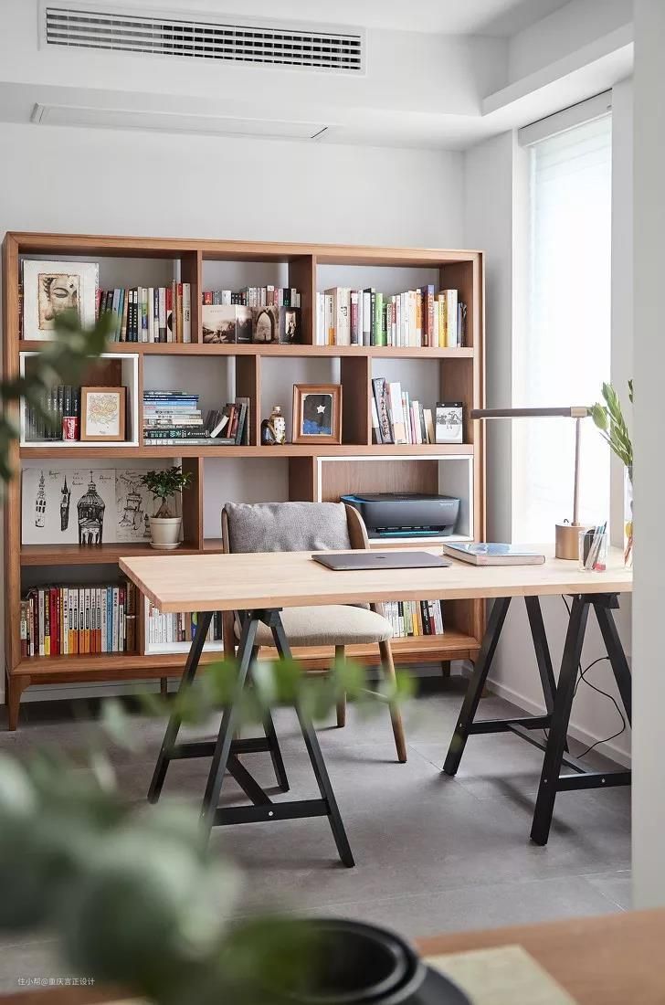 客厅+书房其实是一种很常见的设计方式,一个开放式书房设计,可以在客厅的一角设计一个简单的书房,又是两个独立的空间,搭配书柜灰常的节省空间~