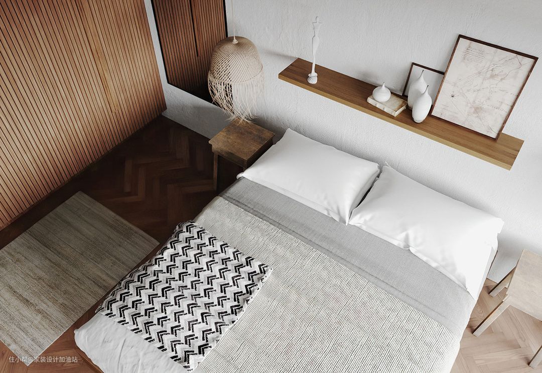 藤制的卧室吊灯与木制床侧组合,形成乡村的效果。