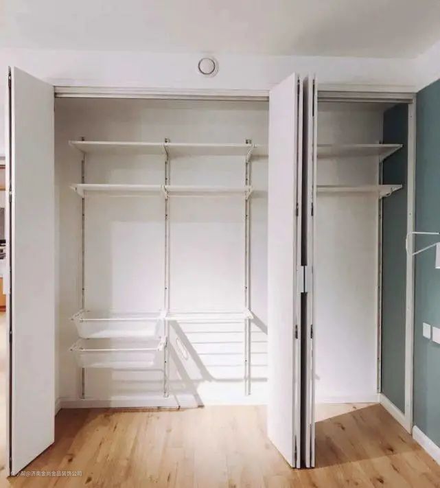 下面这款步入式衣柜,是采用折叠门+宜家艾格特组合形式,用折叠门的好处是,平时合上门就是一面柜门,当打开之后就是一个开放的步入式衣柜,内部衣物一目了然,拿取非常方便,不占空间还光线好。