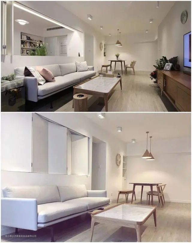 这种折叠窗非常适合在房间分区划分中使用。如用在客厅与玄关之间的沙发墙上,如果是一面隔墙在视觉上势必显得拥挤,而设计一个折叠窗,打开后立马空间感增强,通透敞亮,就不显沉闷了。