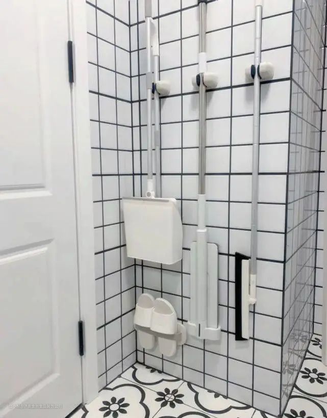 除了折叠拖把盆,对于小户型来说,卫生间里各种日常清洁工具都应该壁挂,应尽量选用通用型的可伸缩的清洁工具。因一是本身可伸缩,壁挂后省地方;二是通用型的,用坏只需更换清洁头等,清洁杆可以长期使用。