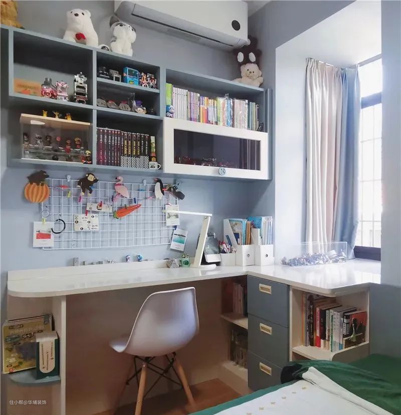 ▲儿童房面积不大,有个外凸的飘窗,便定制了榻榻米+书桌组合,充分利用了空间。定制了榻榻米+衣柜一体化设计,节省空间,收纳功能也不容小觑。
