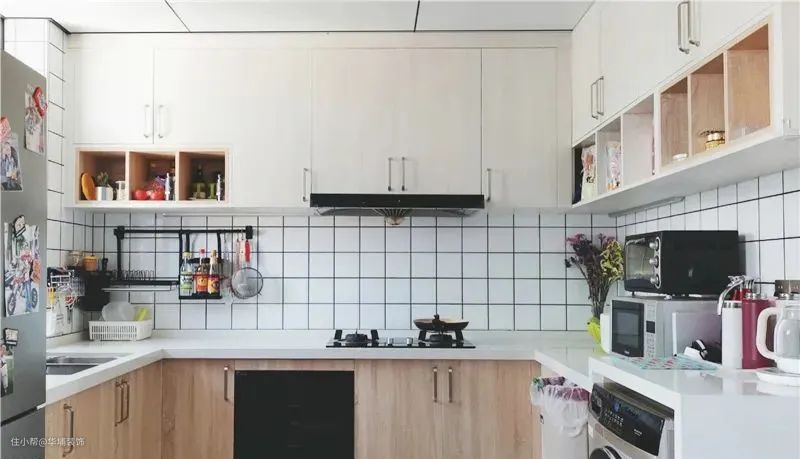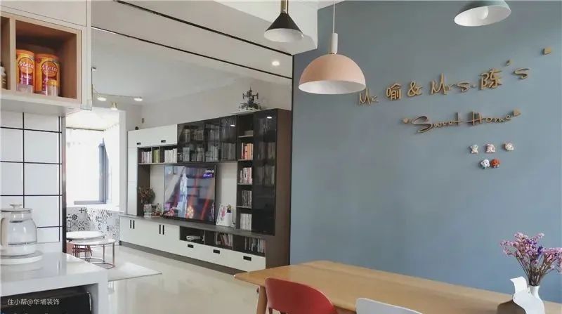 ▲打通厨房隔墙,采用餐厨区一体化设计,看上去更宽敞明亮,动线也更为合理。餐厅,背景墙刷了灰蓝色,搭配几盏精美的吊灯,大大提升了颜值。厨房,采用U型的橱柜布局,并将冰箱、洗碗机做嵌入式设计,充分利用空间。