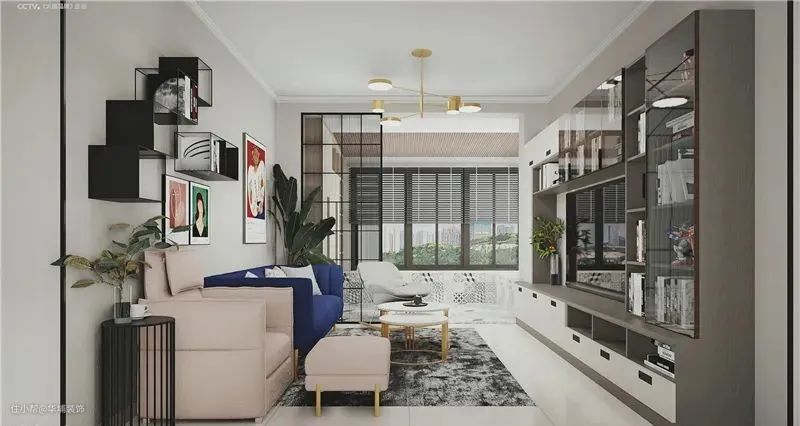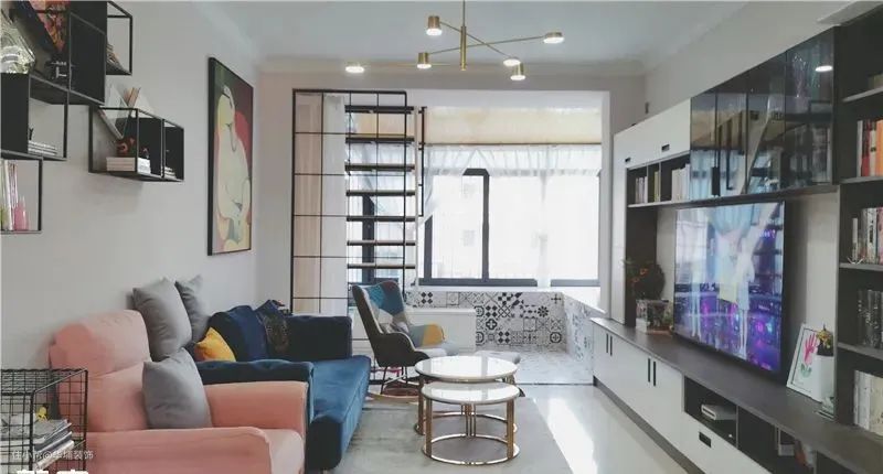 ▲客厅,整体以白色+褐色为主,加上粉+蓝+黄铜做点缀,在简单清新的基础上,增添精致感。沙发墙,艺术挂画+铁艺收纳筐组合,创意有个性。电视墙打造回字形电视柜,满足了客厅的收纳需求。